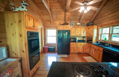 The perfect vacation spot! This is a beautiful log cabin home with everything you will need for the perfect vacation. It has 4 bedrooms and 3 full baths, large spacious rooms and a dock with deep water. The kitchen is fully stocked, the double oven is great when you have the whole family vacationing. Plenty of seating inside and out. You have a screened in porch off the kitchen and master bedroom. A sitting area outside off the living room. Down stairs you have a big patio with plenty of seating and grills to enjoy cooking outside with the view of the lake. If you get tired of being outside you can come in to challenge someone in a game of ping pong or watch the football game on the large flat screened tv's.
