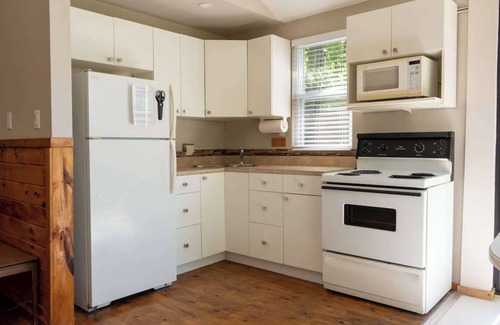 The cottage is located on the gorgeous Pier 100 property, and is bright, has a fully equipped kitchen and comfortable beds. There is a ceiling fan in the living area. Baseboard electric heaters.