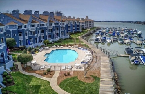 Waterfront condo overlooking saltwater pool and Lake Norman marina! Fully furnished with queen sized bed in master bedroom with private bathroom. The guest room has a queen sized bed as well with a full bathroom (shared with common area). The patio overlooks the saltwater pool and marina, built-in high top table so you can have dinner with a view!