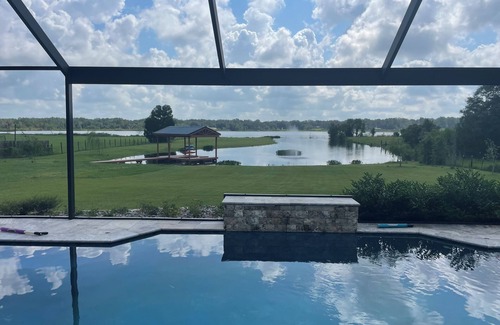 Come relax in the country and enjoy this 5 acre pool oasis overlooking a gorgeous lake! Close to Tampa Outlets, Krate, Wiregrass Ranch and St Leo. 1 hour to Clearwater and 1 hour and 20 min to Disney. Enjoy a cup of coffee while listening to the peaceful sounds of nature; take the kayaks out and watch the sunrise; bring your fishing poles and spend time on the brand new dock; or cook a gourmet meal in the fully stocked kitchen! The home also has kid toys, board games, and books to entertain the little ones. There is also a saltwater aquarium and even chickens roaming outside! The home is on a dirt road with very few neighbors. You will get amazing sunrises over the lake every morning and lots of wildlife including bald eagles, sand hill cranes, hawks, coyotes (you might hear them yipping at night) and other wildlife. Like all bodies of water in Florida there are also alligators in the lake occasionally but they won’t bother you (just avoid swimming in there).