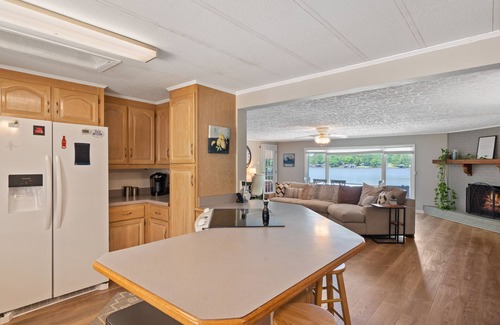 The kitchen is fully equipped with everything you will need. The kitchen counter also has barstool seating. The living room area is very spacious, and you will love the views from the large windows overlooking the pool and lake. The laundry room is right outside of the kitchen area.