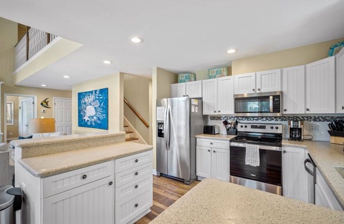 With 4 bedrooms and 3 full baths, there is room for up to 11 guests to stay comfortably. The open concept living room and kitchen is perfect for family meals and relaxing after a day of exploring. Sit and relax on the spacious back deck which overlooks a large lake. The views from the living room and downstairs King suite are fantastic and the wildlife on Fripp is truly one-of-a kind.