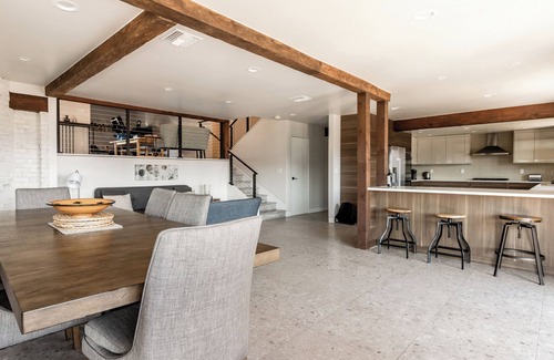 This recently remodeled, 3100' sq. ft. property has an open plan design, huge kitchen, dining area, three living areas, wrap around deck and indoor-outdoor living. The very private garden has incredible views of Lake Hodges, lounge seating, fire pit, dining area, plus large swimming pool & hot tub. All 3.5 bathrooms are new and have rain showers. This home has a history of 130+ positive reviews with an overall rating of 4.99 on another leading platform! This is a modern split level 3 bedroom home + 1 private den. The kitchen, dining room and half bath are located on the lower level, along with access to the terrace, garden and pool. The living room, third bedroom and garage are located at the mid level. The upper level has the master bedroom with en-suite, the second bedroom, and an doorway leading to an office/study area with pull out sofa bed. The upper level also has a wrap around deck which is accessible from the two bedrooms and the study.