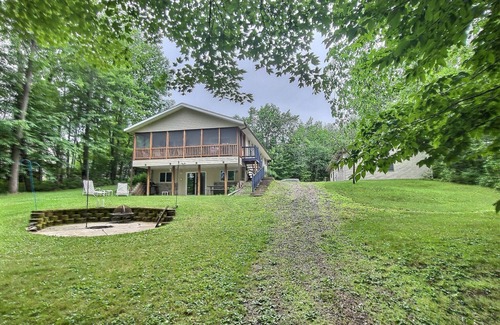 3 beds, 2.5 bathrooms, Futon on the lower level and sleeper couch to accommodate more guests. 2 bedrooms have king size beds, 1 bedroom has 2 sets of bunk beds. Main level features 2 full bathrooms, 2 bedrooms, kitchen, dinig, living room and sliding doors to the screened porch. Lower level features a large living area with woodburning stove, sliding doors to the patio, bedroom and a half bath.