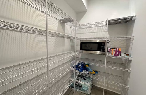 Downstairs you will find the kitchen fully stocked for dining in with stainless steel appliances and a walk-in pantry with a microwave. The dining room table seats four with 3 additional stools at the bar.