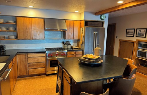 The ground floor has an outstanding open great room with timber joists, wood ceiling, and picture windows to Payette Lake and Ponderosa Park beyond. This room flows into the well appointed dining room and gormet kitchen featuring a Wolf gas range with vent hood - and complete with a full array of cooking wares and dining utensils. The upstairs includes the incredible master suite with large picture windows to the lake, log king bed, clawfoot tub and walk in shower with heated floors. A kids room with a log bunk bed and two twins is also upstairs next to the third bathroom with walk in shower. The fourth bedroom includes a queen bed and walk in closet. Easily and comfortably accommodates multiple families.