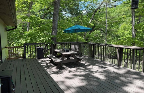 Come and relax, enjoy the beautiful scenery at this cozy lakefront cabin with private boat dock featuring one 14x20 slip for guests to use. The other slip has the owner's personal boat in it and is for Owners Use Only. There is a nice size swimming platform for enjoying and relaxing in the sun or fishing. The cabin offers an ideal setting to unwind and embrace the beauty of the outdoors! Fun for the whole family or perfect for couples! Nestled at the end of Bailey Hollow Cove by water at MM 34, near Captain Ron’s! Cabin home is located on a quiet, paved road within a quick 10–15-minute drive to restaurants, coffee shops, and groceries. The Cave Bar & Grill is 8 minutes away or enjoy dinner and drinks at The Branding Iron which is 7 minutes away. Check out top stars who perform concerts at our Ozarks Amphitheater just 13 minutes away!