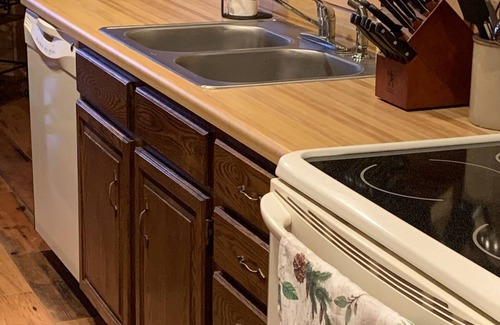 This three bedroom/two bath cabin can comfortably sleep 7 (9 with the futon in the sunroom). The main bedroom has a Queen-size bed and bathroom. The second bedroom has a Queen-size bed, and the third has a double bed with a single trundle. The second bathroom is located in the hall near the other bedrooms.