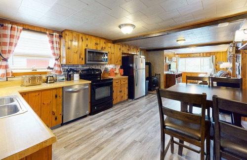 The main home features knotty-pine paneled walls to enhance that cabin vibe. An open layout combines a well-equipped kitchen, a dining area, and a cozy seating area, making it easy for everyone to gather together. The bunkhouse, just next door, offers two additional bedrooms and another comfortable living space. A high chair, baby gates, and children’s books are provided.