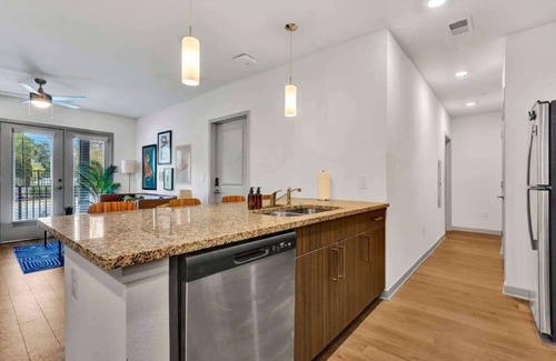 Step into style and comfort with thoughtfully designed spaces featuring luxurious wood-style flooring, stainless-steel appliances, and stunning tile backsplashes complemented by sleek granite countertops. Each home boasts high-powered Wi-Fi, a deluxe 65” flat-screen TV, and contemporary furnishings. Soaring nine-foot ceilings, designer lighting, and ceiling fans create an airy and inviting atmosphere.