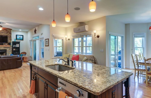 There is room for everyone at this property with a spectacular setting of almost 5 acres. From a gourmet kitchen to sundecks, this home has it all. The outdoor amenities include a boat house with screened porch, beach with an easy walk into the water, three kayaks for use during your stay, a water trampoline, and a large front and backyard. The home is also well equipped with multiple TV's and DVD players for your entertainment and to top it all off, the home has a large bar surrounded by a pool table, foosball table, and air hockey table.