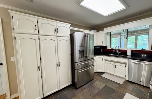 Upstairs is the well-appointed kitchen, equipped with everything you need to prepare meals, from a quick snack to a fantastic feast. Guests will also appreciate the additional downstairs kitchenette, adding extra flexibility for meal prep, storing drinks, or serving snacks.