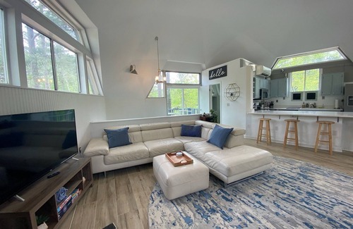 The top floor has a high-dome shape ceiling with a fantastic open living room area with sleeper queen sofa with large deck overlooking the lake, an open-concept kitchen, half bathroom and the coffee porch on the front of the home.