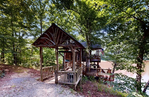 Step inside this cozy retreat, complete with a king bed, cable TV, and a wood-burning fireplace, creating a warm and inviting atmosphere. The tree house boasts a well-equipped kitchen, allowing you to prepare your favorite meals before relaxing on the deck or patio with a view of the lake.