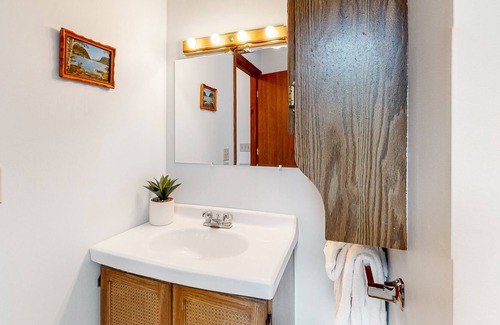 Inside, you’ll find an open floor plan with lots of comfortable gathering spaces. The full kitchen features all the appliances and plenty of counter space, with lots of mealtime seating between the dining table and barstools at the breakfast bar. Spend evenings listening to music on the record player, watch TV, or break out a board game for more together time. When you get sleepy, you’ll find one bedroom on the main floor and two more upstairs. Drift off to sleep dreaming of the perfect lake day you just had, and the one to come tomorrow.