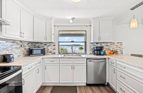 The living room has a cozy sofa and love seat for nights in watching the flatscreen smart tv around the fireplace. This home has internet access for your favorite streaming service. The living room also has 2 comfy chairs directly facing the lake, because when you have views like this, it`s a must. Steps away from the living room, you`ll find the kitchen so you won’t miss movie or lake viewing time when you need a snack.
