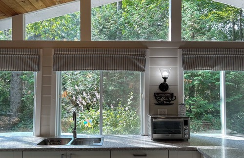 Full bathroom & shower, with an awning window in the bathroom w/ private forest views. Bathroom is shared for bedrooms 1 & 3 upstairs.