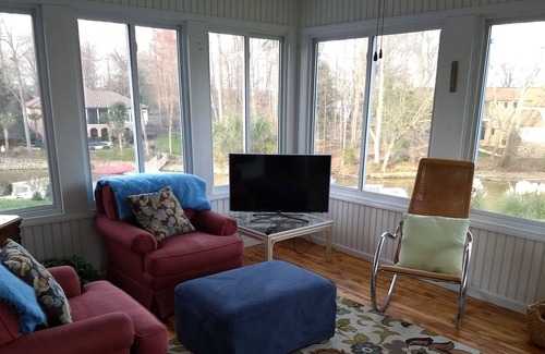 Private home with 3 bdrms, 2.5 baths, 2800 sq ft. This home has wonderful views of the water and the Uhwarrie Mountains, an expansive living room, a well-equipped kitchen and lots of outdoor options – decks, patios, and a screened porch. The dock has room for your boat. 2 kayaks and 2 children’s kayaks are available for your use. The dock has a swim ladder, swimming is encouraged. Fishing is an option – bass, crappie, and catfish are right off the dock. Game room, hot tub. Wildlife abounds – herons, egrets, hawks, eagles, otters, turtles and there is a new family of foxes! The friendly quiet community has a 3 mi loop for a nice evening walk. Convenience and tranquility on the water in Salisbury. Private, perfect for social distancing.