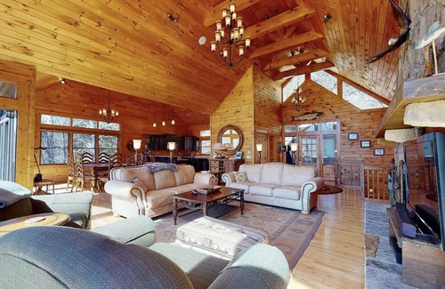 These connected areas combine to make a perfect gathering place for everyone. A fireplace; two couches; over-sized, super-comfy chairs; rockers in front of the windows to watch the lake; a dining table with 8 chairs (and room for more); a bar with four bar stools assure there is room for one and all.