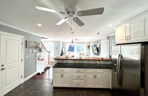 Fully equipped kitchen with dishwasher! Wine openers, coffee maker, blender, crockpot, Belgian waffle maker, juicer with ball mason jars, margarita frozen drink machine maker, toaster, spices, pots, pans, wine, champagne glasses and more.