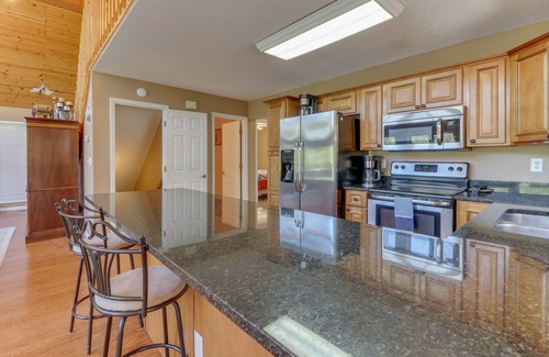 When you enter on the main level, easily accessible by a ramp or just a few steps, you will be greeted with a spacious great room complete with hardwood floors, stone fireplace, vaulted ceiling, new furniture and an abundance of windows looking out onto beautiful Norris Lake. Just off of the great room, you will find the fully equipped functional kitchen with a stainless steel refrigerator, stove, oven and dishwasher. Pots/pans, dishes, glasses, and cooking utensils are all available to use. Take in a meal at the kitchen counter, or one at one of the 2 large dining tables. There is plenty of room for all!