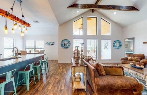 Inside, wall-to-wall windows showcase gorgeous lake views while high ceilings, exposed beams, and wood floors create a stylish vibe. Unwind into vacation mode in the living area and watch a movie on the wall-mounted TV.