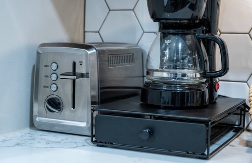 Inside, modern elegance meets cozy mountain charm. Drop your skis at the convenient rack as you enter, and step into a light-filled open-concept living area featuring a plush sectional, a warm fireplace, and a large Smart TV for unwinding after the day's adventures. The space flows effortlessly into the dining area and a fully equipped kitchen with stainless steel appliances, an electric stove, generous counter space, and a breakfast bar with seating for four—perfect for casual meals or morning coffee. High-speed WiFi keeps you connected throughout your stay.
