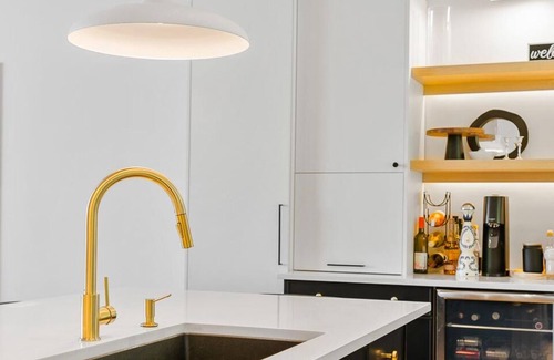 Fully equipped kitchen featuring stainless steel appliances, wine fridge, and coffee maker