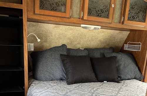 Lake view 30-foot camper offers a queen pillow-top mattress in front bedroom and 4 comfy, adult-sized bunk beds in the bunk house. We have room-darkening shades in the entire camper so everyone sleeps well! Good Rest = Good Vacation.