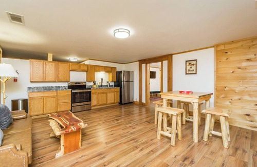 The cabin has a five bed/four bath floor plan on three levels with a master bedroom on the main floor, with only two steps into the house from the parking area. Down the hall is another large bedroom with two bunk beds: a twin-over-twin and a twin-over queen. Upstairs is a loft bedroom with a queen bed and small crib and has its own bathroom. Downstairs is a second kitchen and two other bedrooms: one with a king bed, one with a queen bed, fireplace, and private office space with a desk.