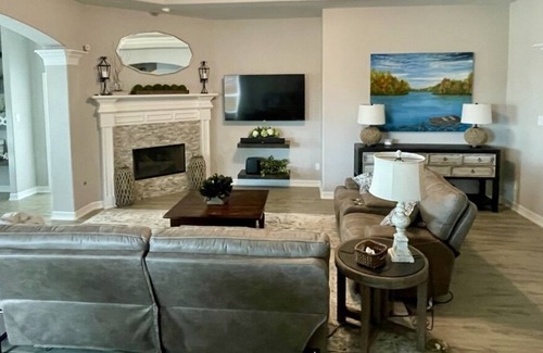 Our Lakeview Retreat sleeps 8 with floor-to-ceiling windows that capture the peaceful views of our neighborhood lake and beautiful sunsets on our oversized patio with fireplace. Enjoy a 4 bedroom, 2.5 bath with an open kitchen and living room overlooking the lake and super fast WiFi. Ideally located minutes from two grocery stores, Premium Outlet Mall, shopping, movie theater and great restaurants to name a few. Make this your home away from home at Lakeview Retreat.
