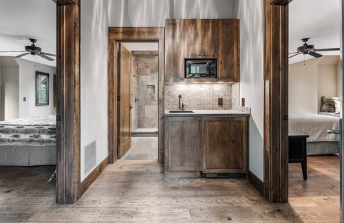 The main floor features a huge great room with towering stone fireplaces both indoors and out. Luxury furnishings and modern amenities are everywhere, including the adjacent chef's kitchen, which of course is completely outfitted with high quality appliances from the Thermador rande to the Miele espresso machine built-in to the formal dining room hutch. Also on the main floor you'll find a wine room and half-bath at the entry foyer as well as a king bedroom suite we call the "portico" bedroom.