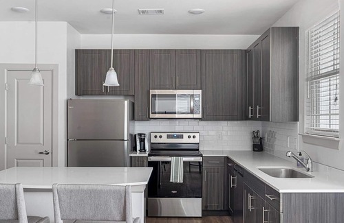 Tucked into the peaceful Pflugerville neighborhood, The Parker Austin offers a stylish retreat just 15 miles from downtown Austin. Ideal for short-term visits, work trips, or extended stays, our fully-furnished apartments feature full kitchens with stainless steel appliances, stylish furnishings, and in-unit laundry. Outside your door, enjoy two resort-style pools, a dog spa, and coworking spaces with conference rooms.