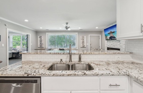 Each of the three bedrooms is thoughtfully designed with plush bedding, ensuring a restful night’s sleep. The home comfortably sleeps **up to 9 guests**, making it perfect for families or groups. Primary Suite with King Bed and Ensuite Bath. Guest Bedroom 1 has 2, Queen over Queen Bunk beds! and the last bedroom has a Queen over Queen Bunkbed.
