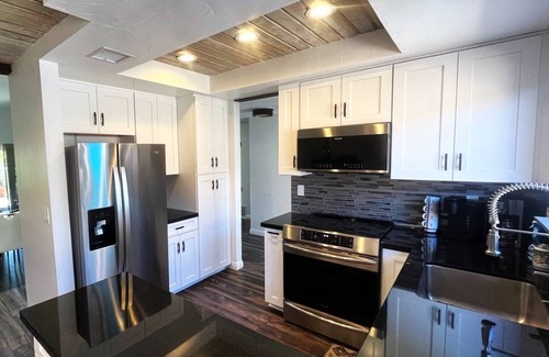 Features include original tongue and groove ceilings, contemporary barn doors in the main bedroom, vaulted ceilings in bedrooms and the living room with motorized window coverings. All new windows and doors in 2024! Interior updates include laminate wood floors, kitchen cabinetry with soft closing doors and drawers, granite countertops, new appliances including induction stove top. Both bedrooms have new mattresses, pillows & bedding, plus large double closets, and stylishly re-designed bathrooms.