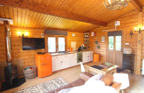 - Traditional authentic log cabin interior with Salamander log burning stove and free logs