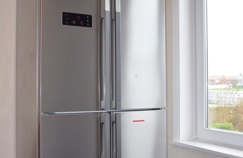 The large dinning kitchen includes a dish washer American Style Fridge/Freezer with Wine Cooler (bottom right-hand door) a washing machine and a large eight-seater dining table.