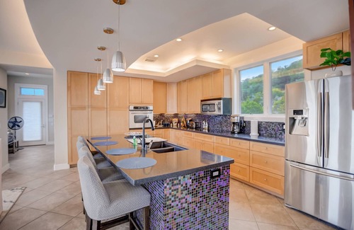* Fully equipped gourmet kitchen with stainless steel appliances and granite countertops.