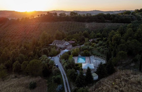 The estate Il Melograno Country Resort is in the heart of Italy and has everything you need for a comfortable holiday or retreat, it consists of three separate properties with 13 bedrooms and 12 bathrooms to accommodate up to 29 people, 4 kitchens, 4 washing machines, a private pool with solarium and sun beds, a 100 m2 function room, as well as gazebos and outdoor bbq area.