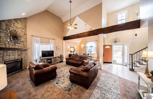 This large family home at LAKE BARKLEY sits on a 2.3 acre lot and has everything you want plus more! With 6 bedrooms and 4.5 baths, easily to house friends and family with over 4700 sq.ft. of living space. The homes provides tons of natural light and designed with luxurious vaulted ceilings in the living area and master bedroom. The 2 bed/1 bath walk-out basement has a spacious living area, a kitchen, and utility room. The upper floor offers 2 bedrooms with a jack-and-jill bath along with an ultimate kids bunk room that sleeps 10! The outdoor space is great for grilling out and relaxing after a day on the lake. This property offers a retention pond on property (not accessible to Lake Barkley) for fishing, kayaking (not included), swimming, and wildlife watching. Boat rentals are available at 2 close marinas (Hubb's and Buzzard Rock). Have your own boat? The boat ramp is a 3 min drive from the house.