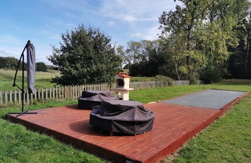 The large main garden is lawned and has a decked barbecue area and boules court.