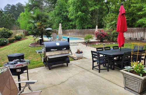 4200 sqft home for rent during Masters week. Ten minutes from Augusta National. Home has 5 bedrooms with a library with a day bed with trundle. 20x18 custom made granite pool with 8x10 splash pad area. Large outdoor patio with seating and smoker/grill. House has a gym in the garage with squat rack, pull up and dip bar, bench press, Mirror, and Peloton bike. Master bedroom in extra large with King size bed. Neighborhood is in secluded subdivision. Kitchen includes coffee bar with coffee machine, espresso machine, and Kuerig. Large 80" TV in main room with seating for large number of people. Each room has a TV and high speed internet.