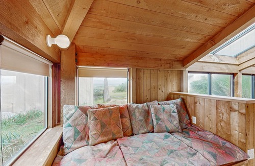 With a spacious floor plan and truly spectacular ocean views, this peaceful home is an ideal escape for your next family holiday or couples' getaway to the Northern California Coast. Your vacation begins in the great room, where exposed beams create a wonderfully rustic atmosphere and solarium-style windows bring the magnificent outdoors in. Turn on the gas fireplace each morning as you read the newspaper on the sofa, or use the telescope to watch for whale spouts on the horizon. The immaculate open kitchen enjoys the same panoramic ocean views and features modern appliances to make meal preparation a pleasure. Lay out appetizers and wine on the kitchen counter, gather for dinner around the dining room table, and leave the post-meal clean-up for the dishwasher. Spend a relaxing morning at home playing a board game, using the WiFi to work in the office, or reading in the comfort of the library as the stereo plays in the background. Once the morning fog melts away, you'll find a gas grill in the sheltered outdoor courtyard, as well as a patio table on the deck for al fresco meals with an ocean view. Take a soothing soak in the hot tub at sunset, watching the ocean below for harbor seals, sea lions, and dolphins. Back inside, you'll find a total of three cable TVs, a DVD and Blu-ray player, a VCR, and a selection of VHS movies to watch during cozy evenings in.