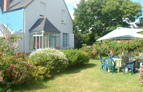 A small veranda opens onto a large enclosed garden, with garden furniture and barbecue.
