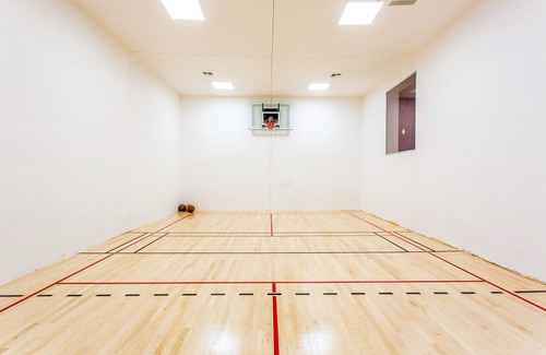 two-lane bowling alley, a golf simulator, a sports court and a home