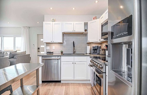 Inside the home you’ll find the perfect blend of sleek, modern finishes and contemporary flare in spaces that have been meticulously curated to foster connectivity and entertainment. Sink into plush living room sofa seating while you keep up with episodes of your favorite stream-ready shows on the mounted smart TV. The open floorplan leads you right to the fully equipped kitchen showcasing stainless steel appliances as well as an island, glossy stone countertops, and sleek white cabinetry stocked with cookware and dining ware. Grab a high-top stool here for quick and casual bites or gather around the chic dining table with seating for 6 for formal meals or a spontaneous game night.