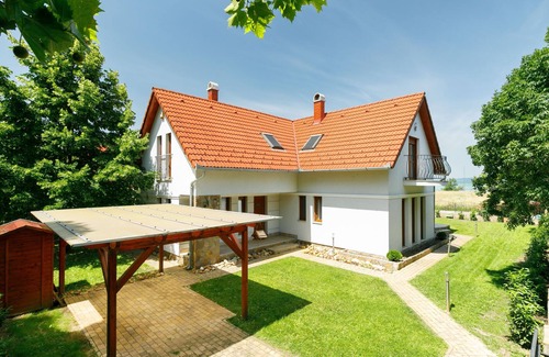 Balatonőszöd 8 km from Balatonlelle: Large, beautiful house "Lavender", 2 storeys. In a sunny position residential area (villas), 100 m from the lake, from the beach. Private: property (fenced), garden lawn. Terrace, barbecue. In the house: WiFi, central heating system, air conditioning, burglar alarm system, washing machine. Roofed, parking. Grocery 3 km, supermarket 8 km, restaurant 140 m, bakery 3 km, café 2 km, thermal baths "Csiszta" 38 km. Surf school 6 km, sailing school 8 km, tennis 2 km, cycle lane 50 m, children's playground 50 m. Nearby attractions: Siófok Giant Wheels 30 km, Kereki Dinosaur Park 17 km, Tihany 15 km, Bella Zoo Siófok 26 km, Festetics Castle 62 km. Please note: baby equipment (included).