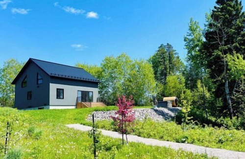 A nature getaway awaits you at Domaine Batiscan, located in Saint-Adelphe, Mauricie. Set on a 200,000-square-foot property, this chalet can accommodate up to six people. It features two closed bedrooms: a master bedroom in the mezzanine with two queen beds separated by a partition for added privacy, and a ground-floor bedroom with one queen bed. Large windows flood the space with natural light and offer breathtaking views of the Batiscan River and the surrounding nature.