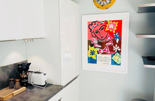 The apartment features all-new furnishings throughout, including a cozy bed and a roll-out sofa—ideal for relaxing after a day of exploring Nice’s sunlit streets. The fully remodeled kitchen is outfitted with a full-sized refrigerator, ample pots and pans, dishes, wine glasses, and everything needed to enjoy home-cooked meals or local delicacies. A washing machine, central air conditioning, high-speed WiFi, Nespresso machine, and a TV with an array of channels offer all the comforts of home.