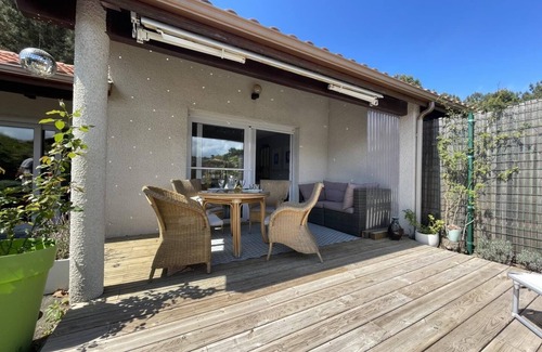 2.5 km from huge sandy beaches and close to Lake Hossegor, as well as all amenities, you are in Capbreton on the south coast of the Landes. The Clairière aux Chênes residence has more than 30 semi-detached or independent houses providing the common swimming pool service. The gîte le petit Pin is adjoining, it offers a living room serving as a kitchen-living room-lounge. Fully equipped and fitted kitchen with dishwasher, microwave, 4 vitro hobs, electric oven, combined fridge-freezer. For your meals open kitchen with high stools. On the living room side, sofa, armchair with television, wifi connection. You have in the bedroom a large bed (160x200 cm) and a bathroom with bath and toilet. A second living room is at your disposal with a sofa bed acting as a bed (160x190). washing machine in the corner of the second living room. You will have a pleasant wooden terrace of 40 m² with sunbeds and garden furniture, as well as a barbecue. The land is fully enclosed, approximately 90 m². Your vehicle can park in front of the cottage, or public parking available at the entrance of the residence. The collective swimming pool is secure 6x12 m, usable from June to September and your pet is welcome. Campsite nearby, located behind the residence. For your comfort, sheets, linens and towels are included. Gas heating, with fixed price if use. For a pleasant stay in the heart of Landes Atlantique Sud, a stone's throw from the beach and cycle paths, your stay in the Landes is here!